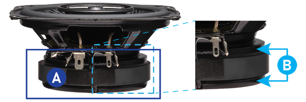Veliko magnetno kolo [A] stvara dovoljno snage da pokreće membrane vufera i reprodukuje zvuk visoke gustine. Primenom crne boje na delove okvira i ploče [B], toplota se efikasno oslobađa unutar magnetnog kola, što dovodi do smanjenja temperature zvučne zavojnice kako bi se obezbedila efikasnost i dugovečnost zvučnika.